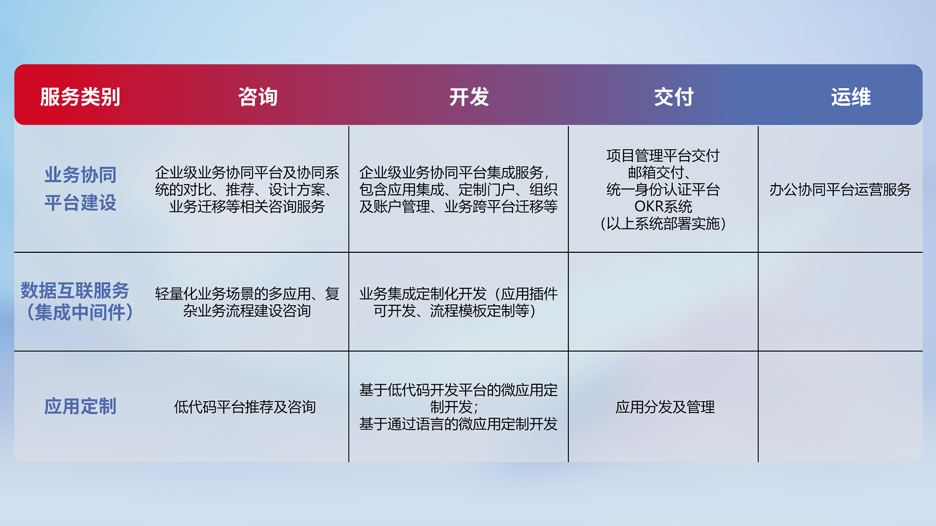 针对钉钉、、企微、、、IDaas等平台级产品提供产品的规划、、、方案、、、、交付、、、、定制化开发等服务,,,,实现如统一协同办公、、、、智能客户服务、、、混合会议管理、、智能数据查询、、、等业务场景,,,,实现数字化转型。。